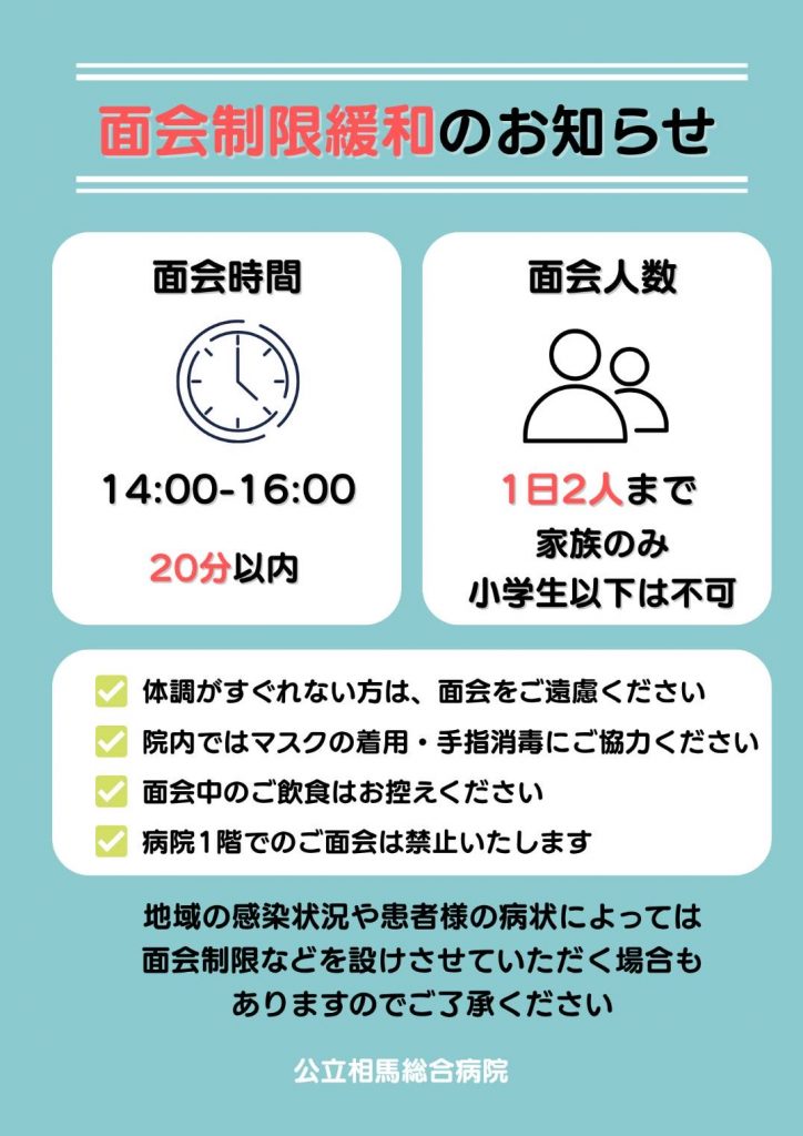 令和7年11月より全国的なインフルエンザや新型コロナウイルスの感染増加に伴い、院内感染対策の一環として当院に入院されている患者様への面会を制限しておりましたが、令和8年3月28日(土)より制限が緩和されます。